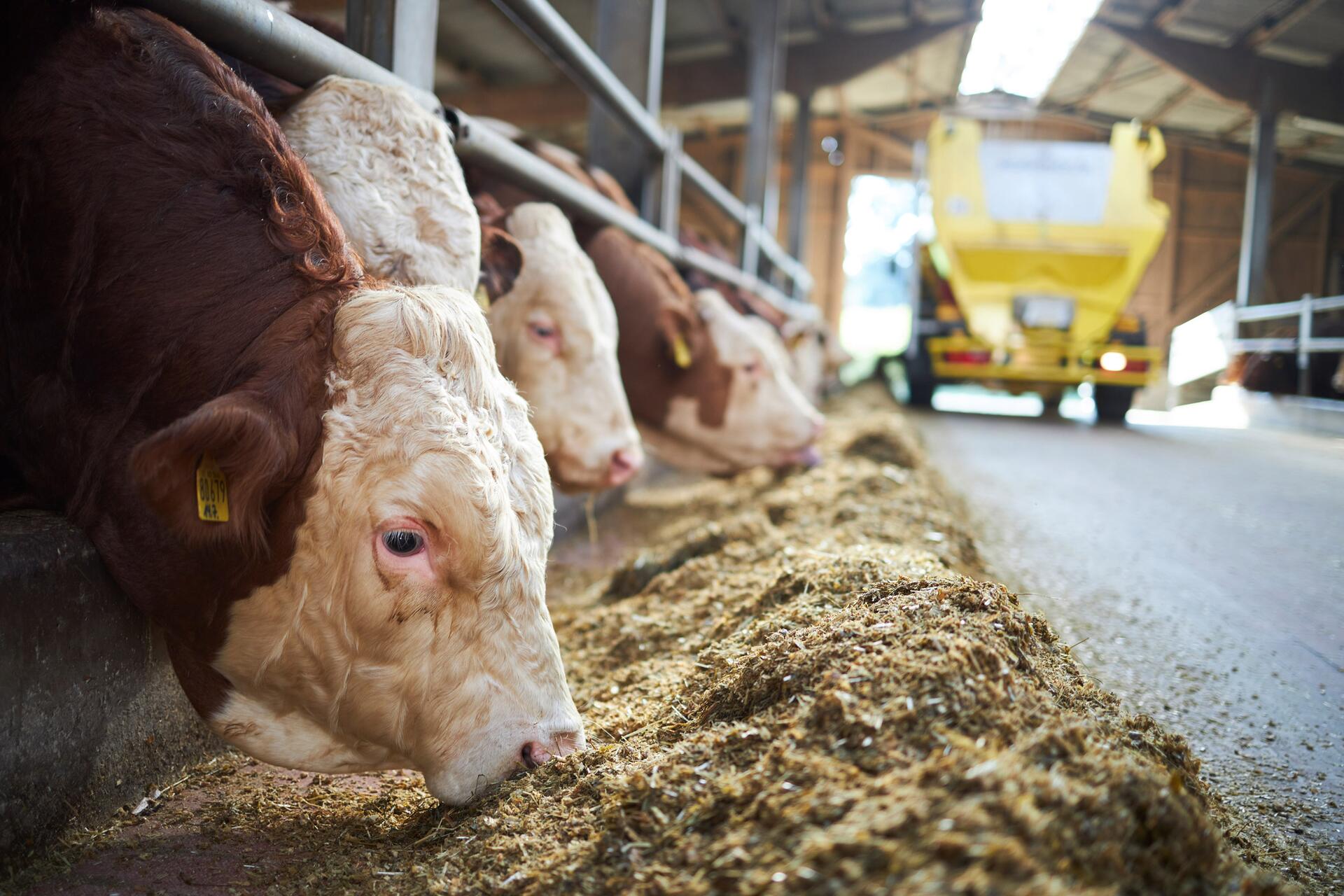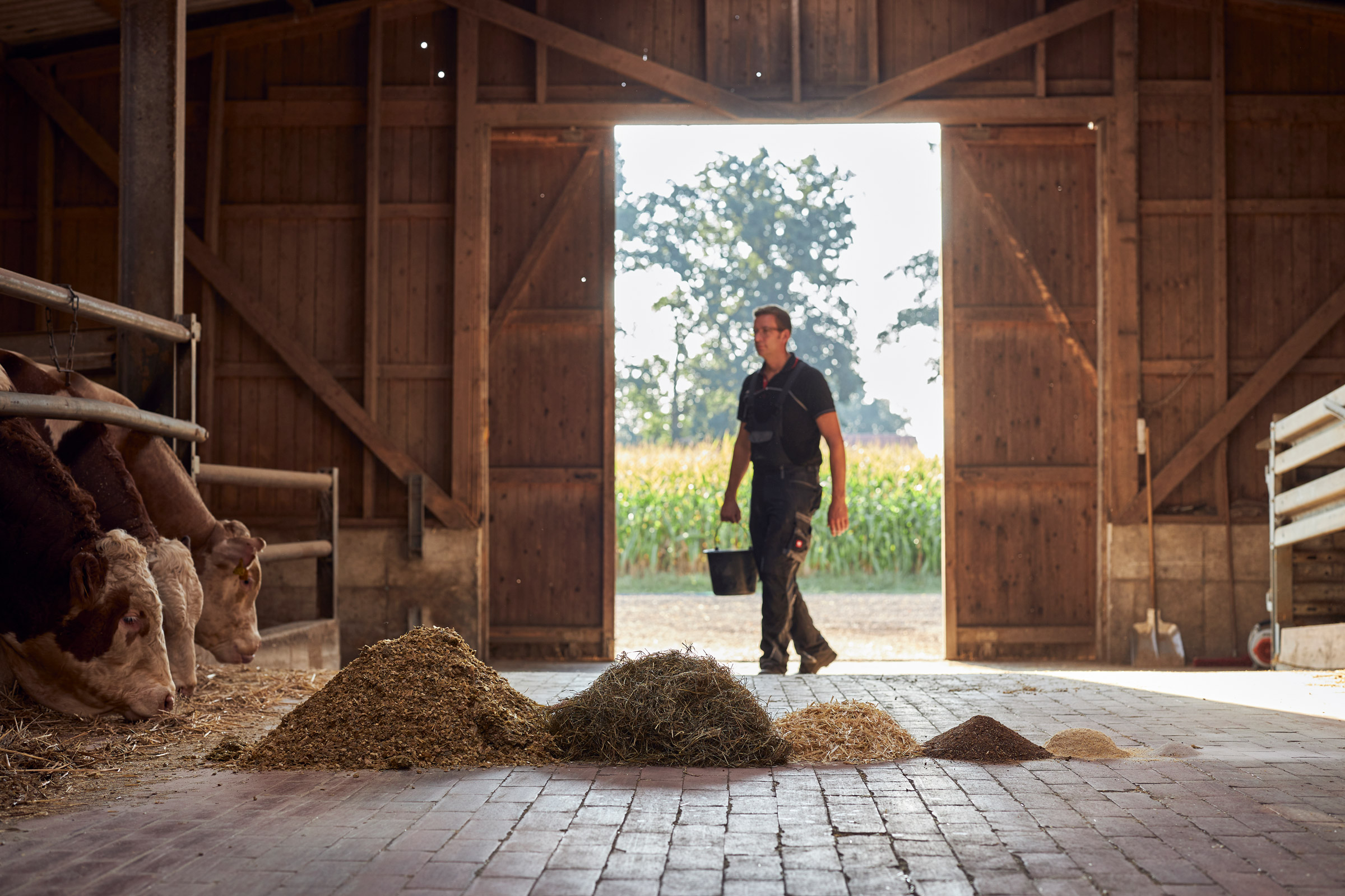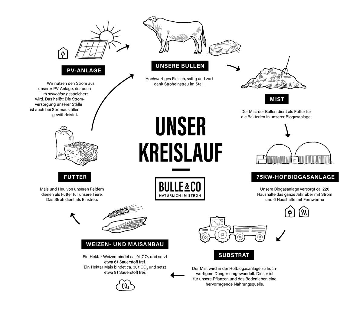 Von Anfang an leben unsere Jungbullen in grossen, offenen und lichtdurchfluteten Strohställen, wo sie mehr Platz haben als die Richtlinien es vorgeben. Durch den weichen nachgebenden untergrund des Strohs ist das für unsere Bullen wie ein Fitnessstudio. Sie werden durch eine ausgewogene Ernährung mit eigens angebautem Mais, Heu und Stroh, sowie Kraftfutter zu gesunden Tieren gross gezogen. Das eingesetzte Futter stammt ausschliesslich aus VLOG (Verband Lebensmittel ohne Gentechnik) zertifizierten Futterwerken.